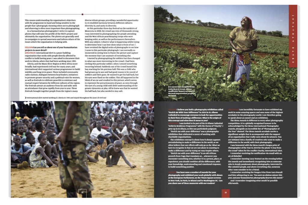 Jonathan Banks is an award-winning British photographer with over twenty-five years’ experience in humanitarian photography. He works with charitable organisations and NGOs documenting important campaigns connected with human rights’ matters. He has photographed a wide range of subjects in challenging situations in over eighty different countries. Jonathan has exhibited his photography in the European Parliament, on the screens at Times Square in New York, as part of the Exposure Awards at the Louvre in Paris, at the “Beauty of Humanity” Art Basel festival in Miami and as a solo exhibition at the Phillips Collection in Washington DC. These exhibitions have been in support of organisations such as International Alert and TASSC International.